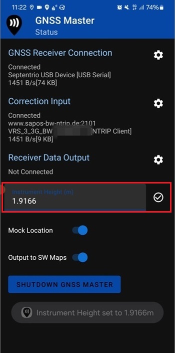 1. Make sure that you set Instrument Height in meters. The instrument height is the exact height between the tip of your survey pole on the ground to the antenna’s receiving plane and it is used to calculate the exact height of the point on the ground. After inserting the height value, click on the checkmark button right beside the field.