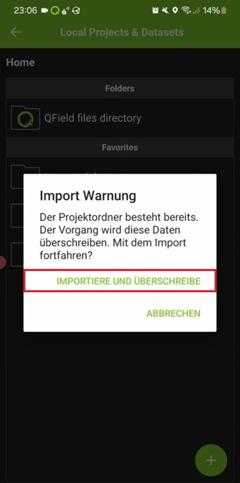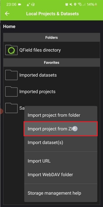1. QField is an Android app that is an counterpart for QGIS on PC. Now import your project in ZIP file. Click on Open local file and then on the + button and Import project from ZIP.
