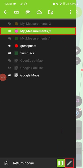 1. In QField open the Burger menu in the top left corner and set the visibility of the layers as you prefer. Set the active layer by clicking on its name and set QField into the edit mode by toggling the button in the bottom right corner.