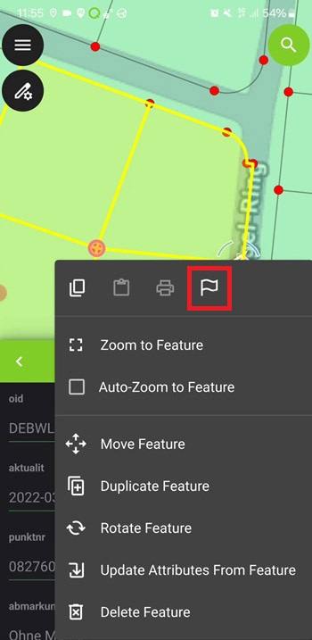1. After clicking on your desired feature, QField will change into the details page of the feature where you can select the menu (three dots) and click the flag icon to start the navigation.
