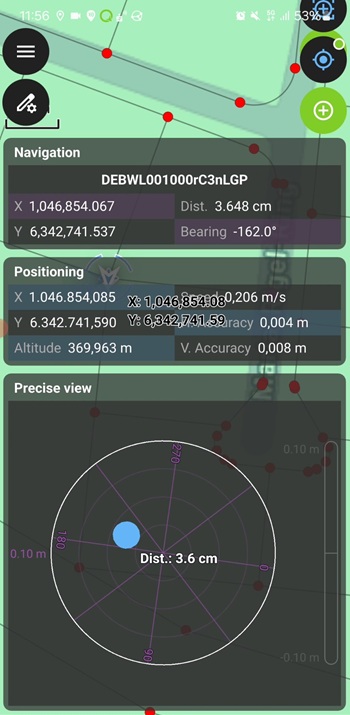 1. The exact behavior of QField when getting closer to the destination can be controlled by long pressing the flag button and selecting Precise View Settings where you can define the distance to the destination when the Precise view windows shall pop-up and an Audio Proximity Feedback (alarm sound) shall be played. Note: If you are using a smartphone with a small display the Precise view window will consume a lot of space on the screen. To hide the Precise view, simply move your survey pole a bit away from the destination point and the window will automatically disappear.