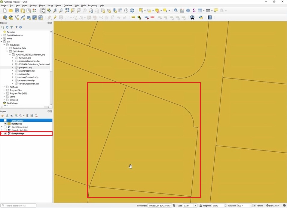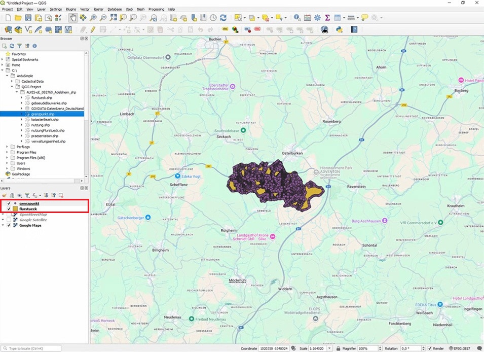 1. To add the previously downloaded shapefiles of cadastral data, which were downloaded at step #1, drag and drop both shape files „flurstueck.shp“ and the „grenzpunkt.shp“ into the Layers pane, similar how it was done before with the XYZ Tiles.