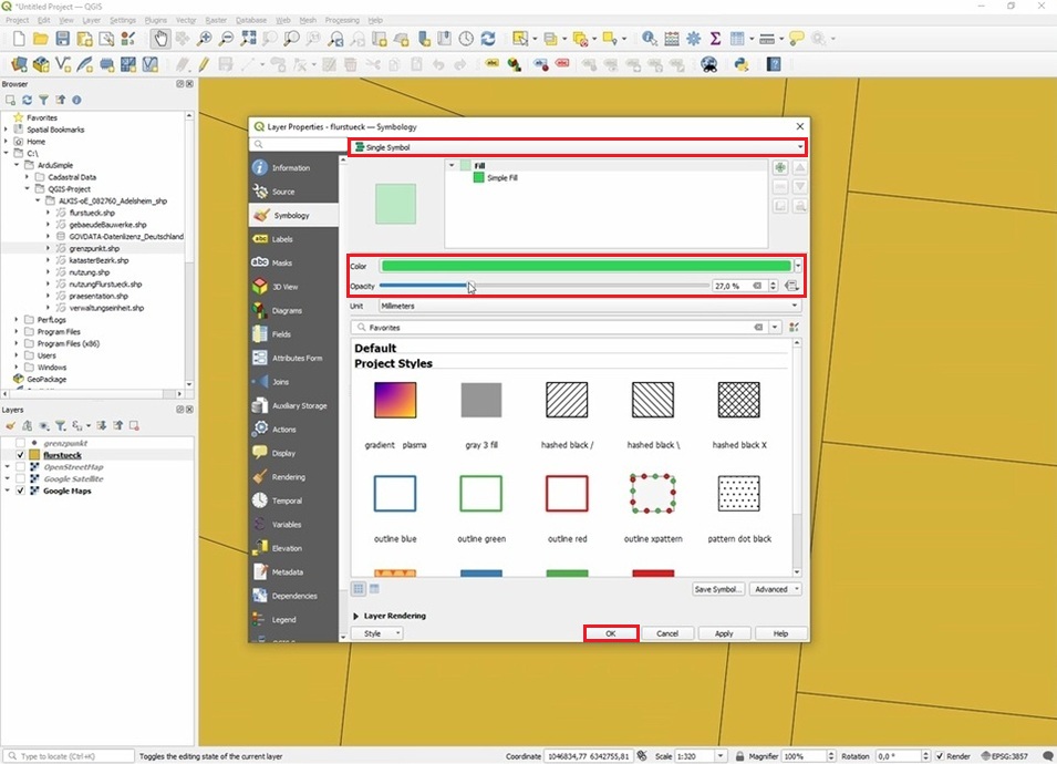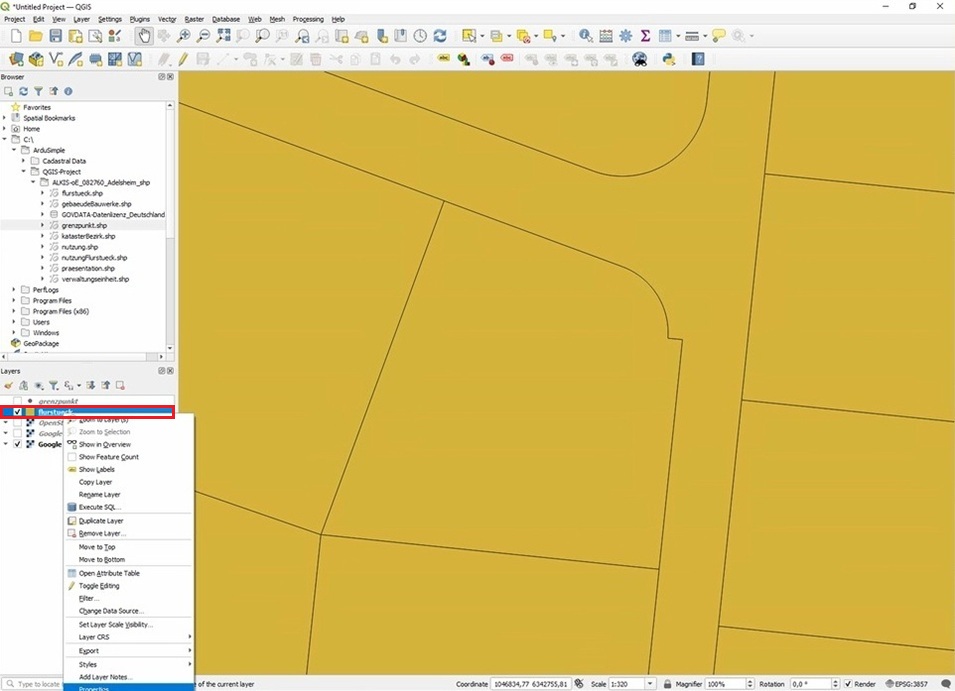 1. By default, the „flurstueck“ layer does not have any transparency which makes navigation hard, as underlying map layers cannot be seen. To make these layers visible, make a right click on the layer name and select Properties.