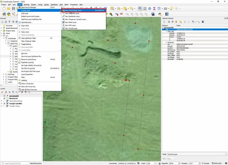 1. To be able to store the GNSS measurements later in the field, create a new layer in the project that will hold the measured points. Go to the menu Layer, select Create Layer and New GeoPackage Layer.
