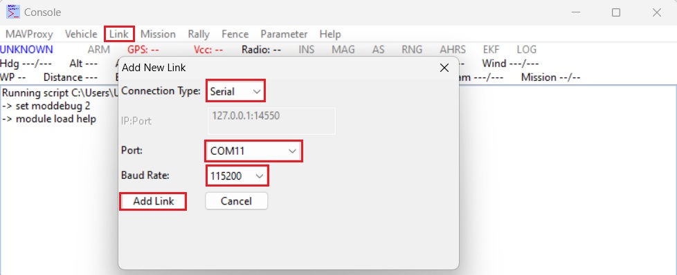 - In MAVProxy go to Link–>Add–>Serial–>Select the telemetry link or autopilot COM port and baudrate (typically the USB connection data rate is 115200 and the radio connection rate is 57600). Press Add Link.