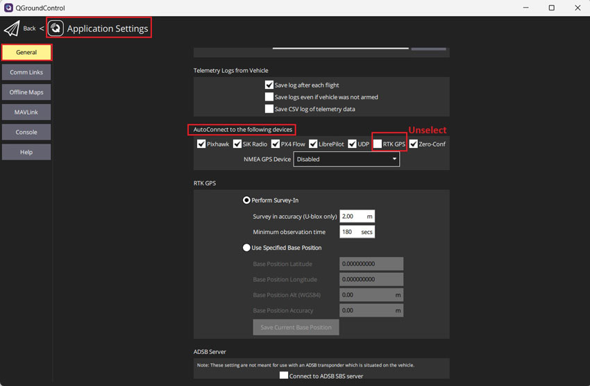 - Go to General–>AutoConnect to the following devices–>Unselect RTK GPS.