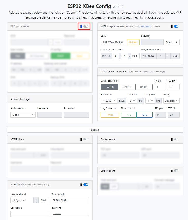 - Connect the WiFi hotspot created by WiFi NTRIP Master (name :ESP_XBee_xxxxxx).