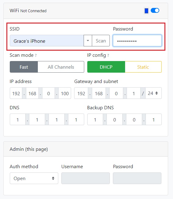 - Enable WiFi option. In the SSID type in the name and password of your WiFi or personal hotspot of your phone.