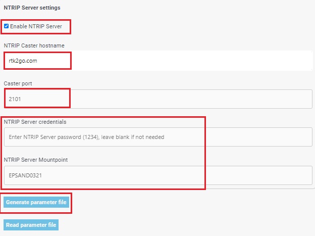 - Enable the NTRIP Server settings. Fill in the information you get from step 1. Click Generate parameter file button.