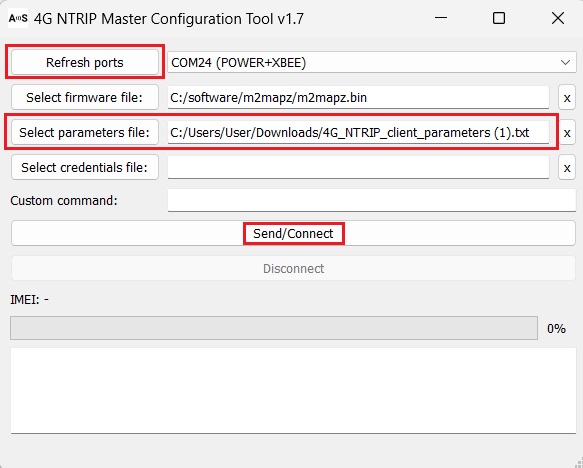 - Use the 4G NTRIP Master Configuration tool (you can download it from the Hookup Guide) to load the parameter file.