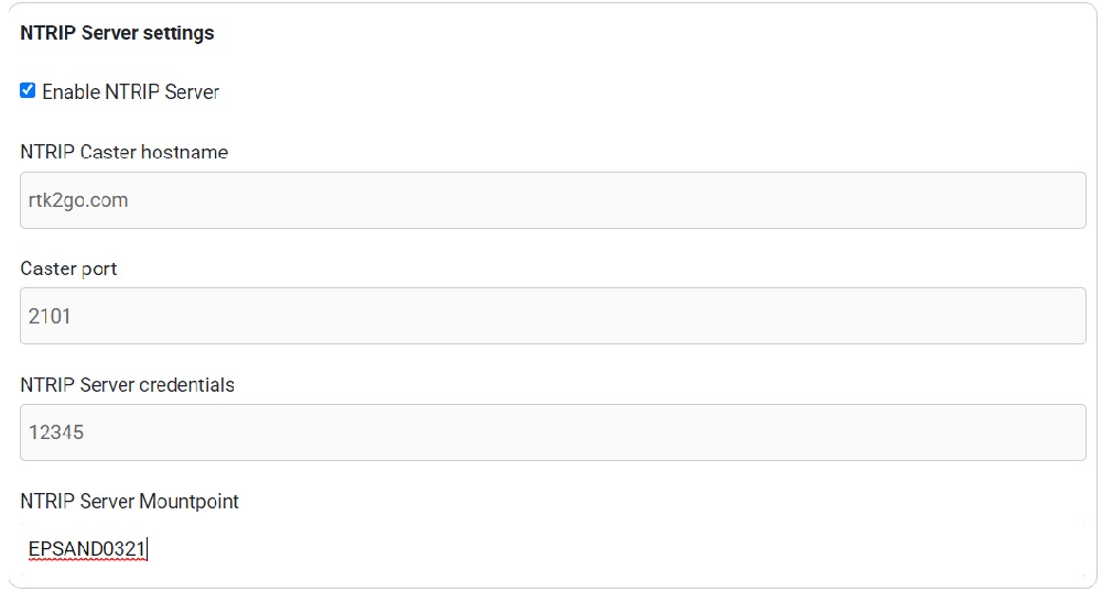 - Go to the Hookup Guide to generate your 4G NTRIP Master Parameters File. When creating the Parameters File, enable the NTRIP Server settings, fill in the information you get from step 1 and click Generate parameter file button.