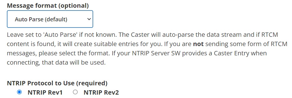 name. Leave the Message format to Auto Parse and NTRIP Protocol to Use to NTRIP Rev1. Other fields are optional.