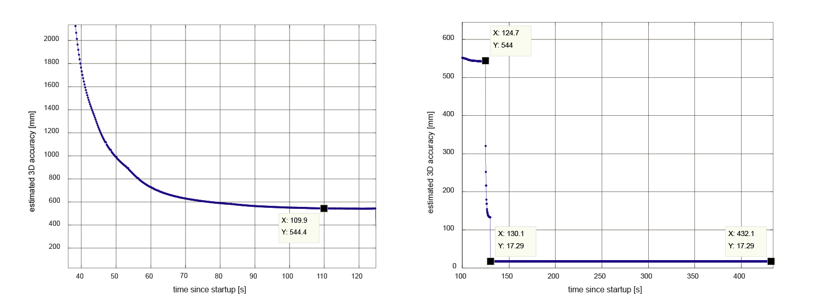 We logged data from a cold startup during 432 seconds and these are the outputs: