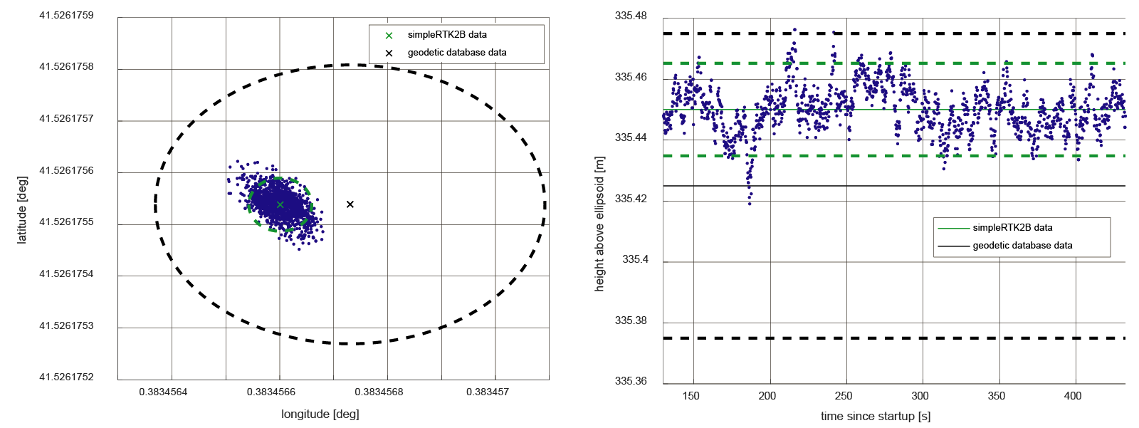 The green crosses and lines show the position and ellipsoidal height provided by the simpleRTK2B.