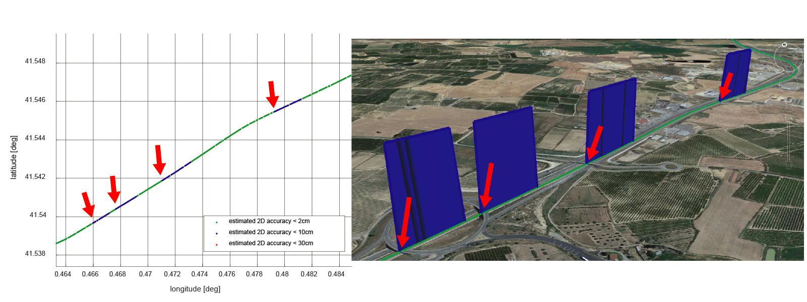 The intermittent decreases in 2D accuracy are caused by bridges crossing the highway and some truck overtakings.