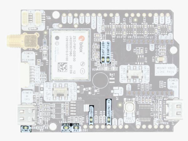 - PVT: LED lights when it was possible to calculate a position from the available satellite visibility.