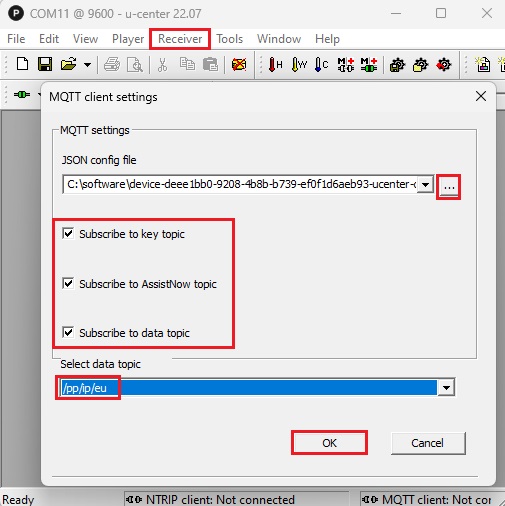 - Go to Receiver–>MQTT Client…–>select the JSON file you downloaded in step 2.