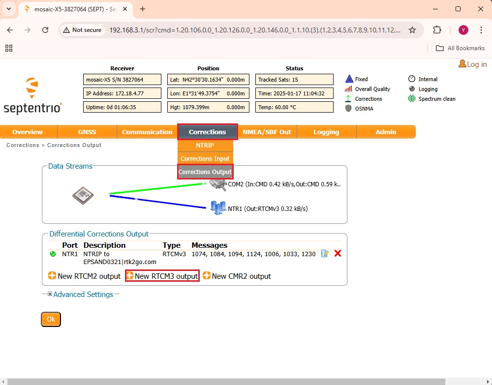 - At Septentrio web interface, go to Corrections–>Corrections Output–>+New RTCMV3 output.