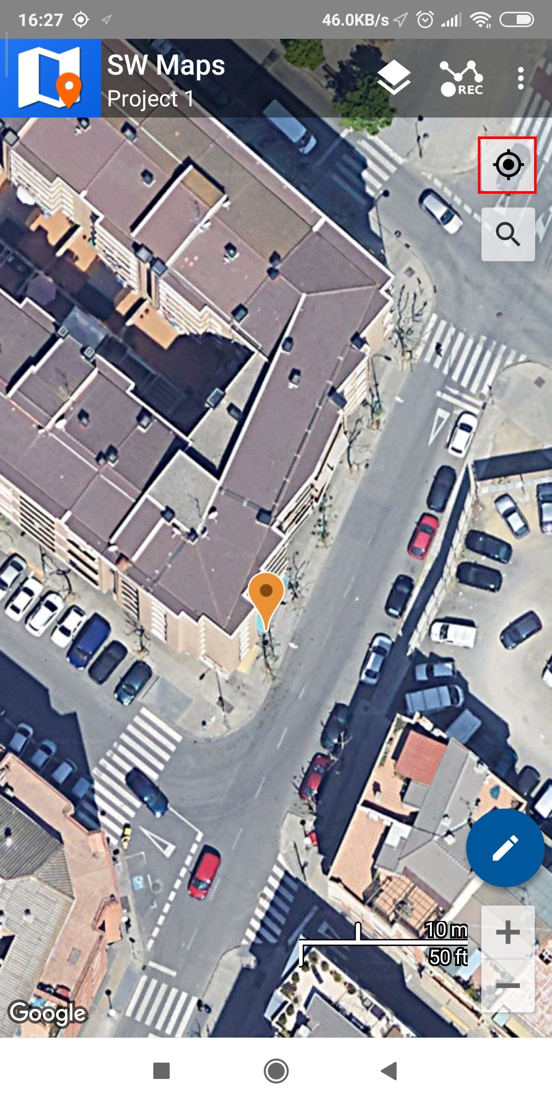 - You can click the button that is highlighted in red to make the app center the map in your receiver location. The pointer showing your location will change its color depending on the fix status of your receiver. Additionally, you have the option to adjust the map layer, include points, tracks, as well as import or export recorded locations, among other features.
