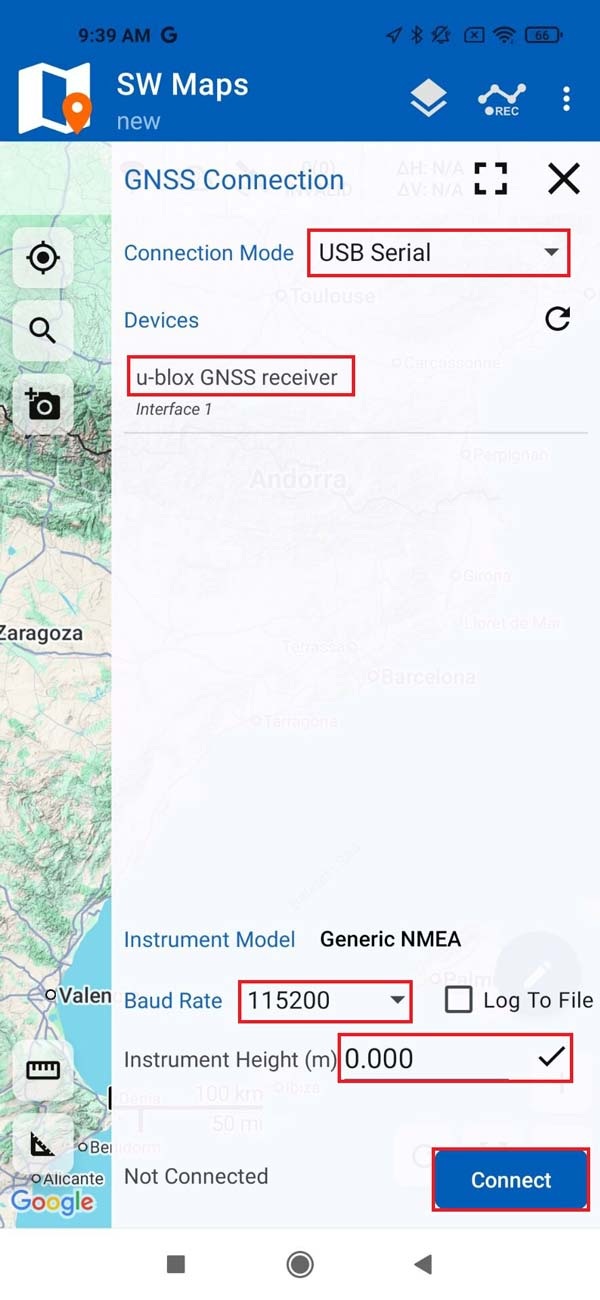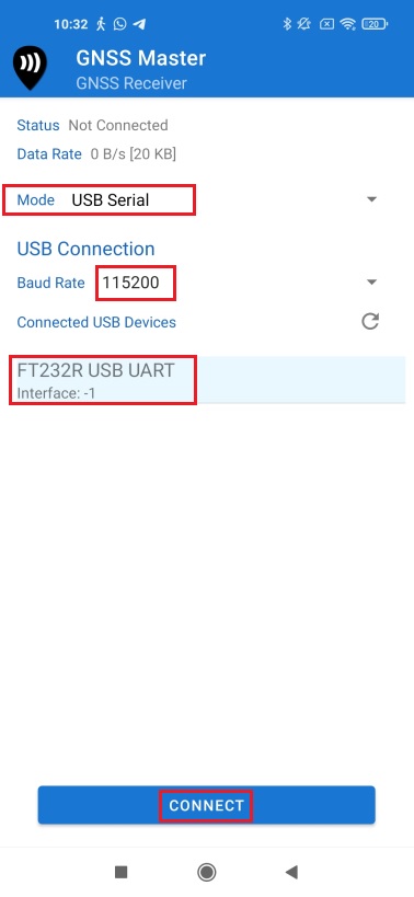 - Connect RTK receiver with your Android device with USB OTG cable.