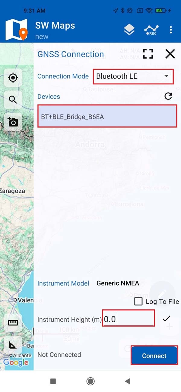 Under Devices, select the one you paired before. Set the Instrument Height according to the height of your pole or antenna, if you want to measure the location on the ground.