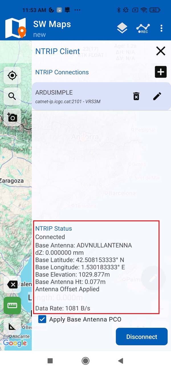 - Back to the main screen, tap on the antenna icon you will see you are using External GNSS and with location and satellites information.