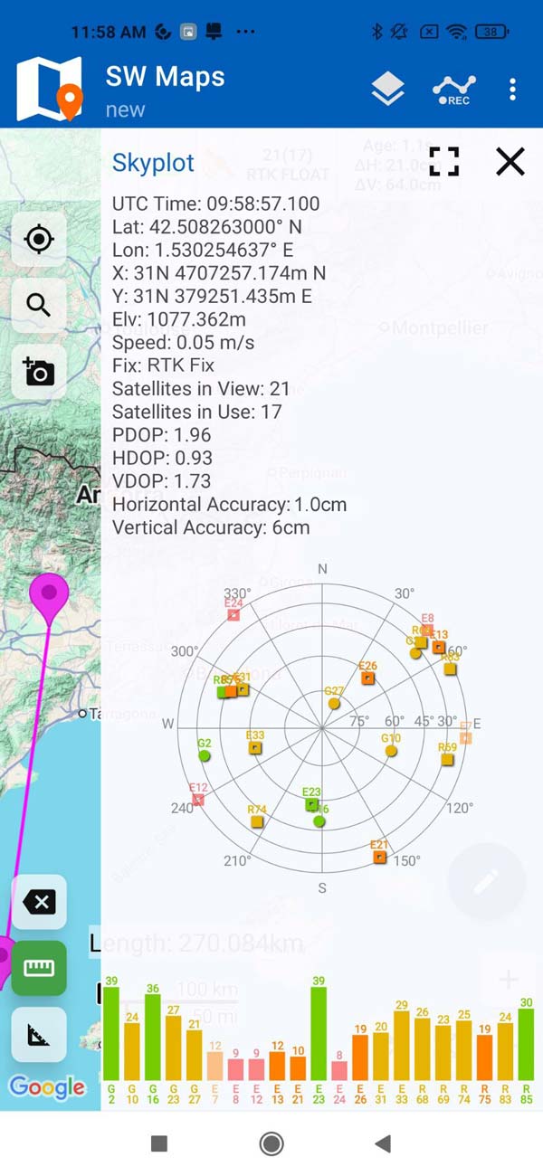 - Go to the SW Maps menu and select Skyplot. You can see the Fix type is RTK Float or RTK Fix and actual position with centimeter accuracy.