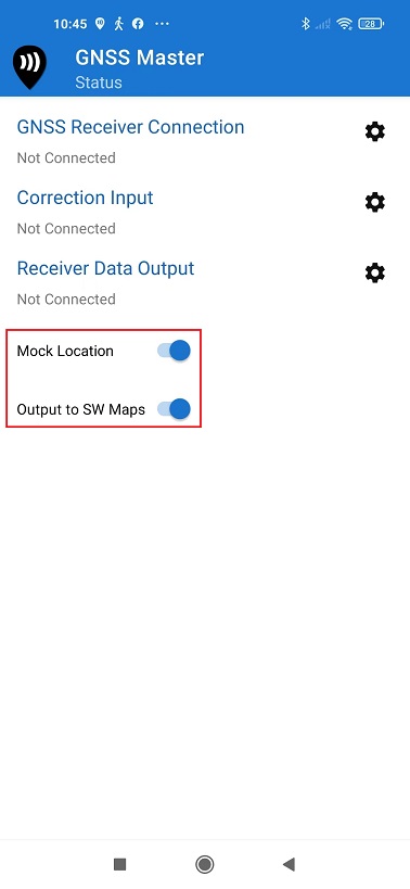- Open GNSS Master app. Check Mock Location and Output to SW Maps.