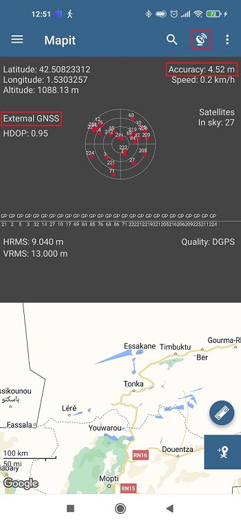 - Back to the main screen, tap on the antenna icon you will see you are using External GNSS and with location and satellites information.