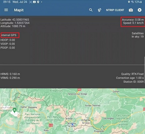 - After accessing to NTRIP correction service you can see in MapitGIS that the accuracy is at the centimeter level.