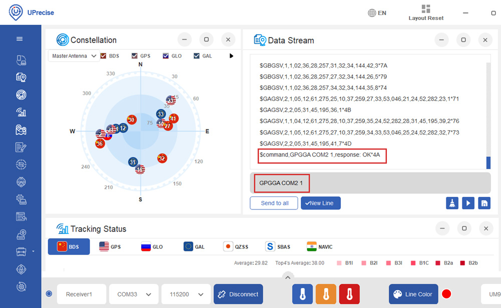 2. For example if you want to send GGA to COM2, at the commend window type in GPGGA COM2 1. It will output 1Hz GGA message at COM2.