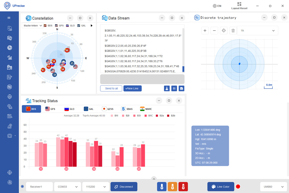 If you need additional information, such as upgrading firmware, configuring the receiver as a base or rover please refer to the Unicore configuration page.