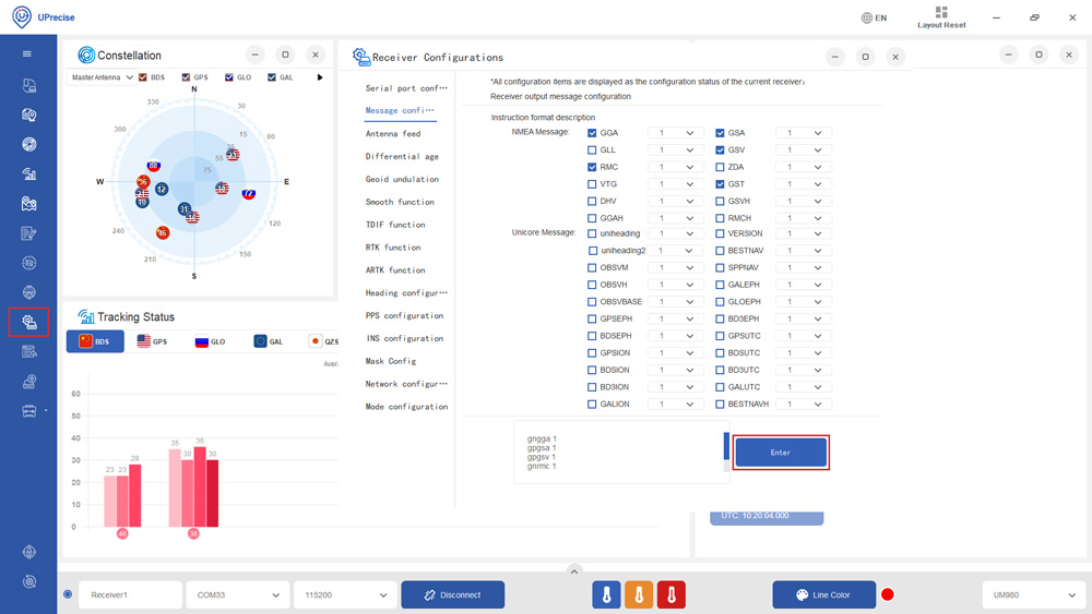 1. Click the Receiver Configuration icon on the left side menu bar. Here you can enable you preferred NMEA messages ( By default NMEA is disabled on this module). We recommend checking GGA, GSA, GSV, GST and RMC. It will work well with SW Maps and most applications. Then click Enter.