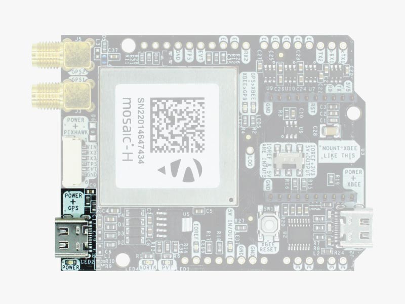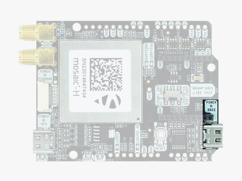 This USB-C connector gives you access to the UART of the XBEE radio (if you mount one), via an FTDI USB-to-UART converter. We find very practical to use this connector to power the board, so you can then connect and disconnect the GPS USB as your wish, without removing the power to the board. You can use any USB wall plug adapter you find at home.