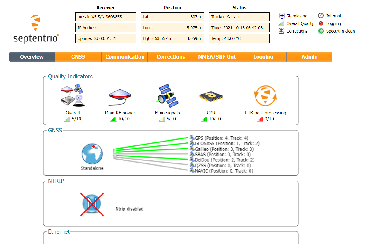 But the nicest thing of this receiver is that if you go to the web browser and write 192.168.3.1, the Septentrio web interface appears, that you can both to configure and monitor the receiver: